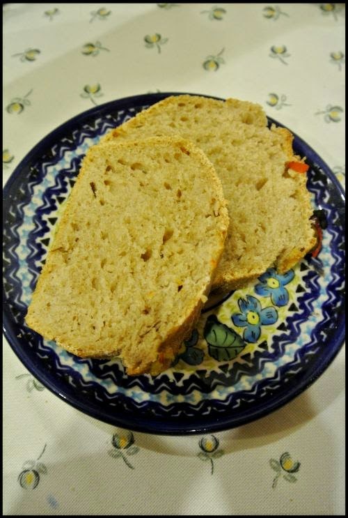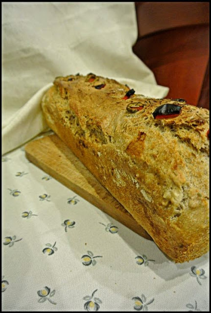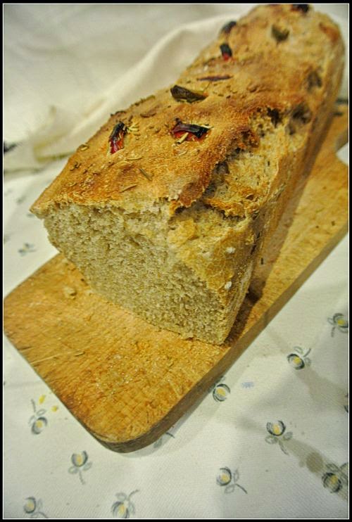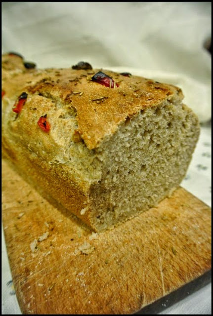 Formę ( keksówka, może być okrągła, mała blaszka – ważne żeby wielkością odpowiadała ) smarujemy olejem/oliwą podsypać spód solą – najlepiej gruboziarnistą. Ciasto włożyć, wyrównać i posypać tymiankiem,solą, ułożyć oliwki, paprykę albo pomidory – możemy użyć przypraw, które lubimy… ale zawsze zachowując tymianek – nadaje świetny aromat i smak. Tak przygotowany chleb włożyć do piekarnika nagrzanego do 180-200 stopni C – zależy jak mocno przypieka piekarnik. Mój jest dość “ostry” dlatego nastawiłam na 180. Czas pieczenia: 30-35 minut.
