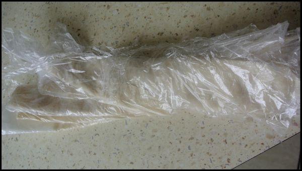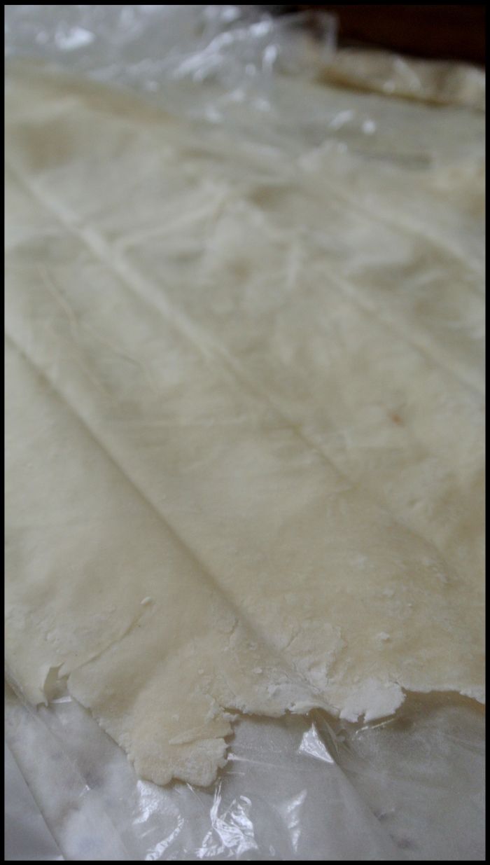 Każdy arkusz zawijałam w folię spożywczą, niektóre też w papier do pieczenia. Obie metody dobre. Należy pamiętać, że jeśli ciasto jest bardziej cienkie, to też jest bardziej “suche” – takie powinno być. Na 2 arkusze folii spożywczej połączone ze sobą ( 1 za mało) wkładałam ciasto i przykrywałam kolejnym arkuszem folii. Zawijałam w rulon, a boki szczelnie skleiłam i włożyłam do lodówki.