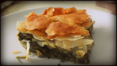A na koniec… gotowy wyrób z użyciem ciasta filo : grecka Spanakopita. Na wierzchu użyłam pozostałych skrawek, stąd jest tak bardzo pokruszone. Ale jak dla mnie: lepsze bardzo kruche, niż twarde! 😀