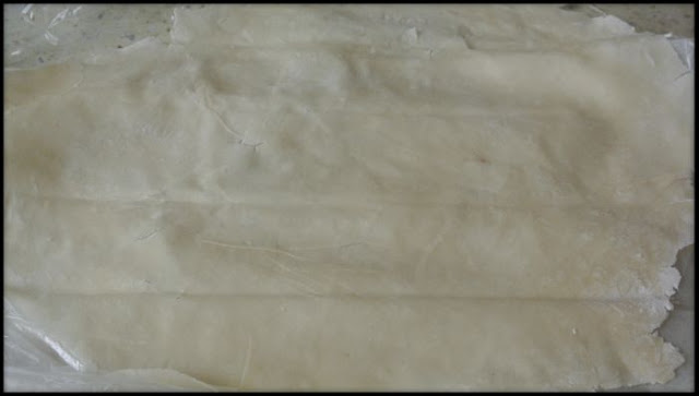 2) Przygotować 2 arkusze papieru do pieczenia – duże. Posypać trochę mąkę. Położyć ciasto też musi być oprószone mąką – powinna zostać od wcześniejszego podsypywania. Przykryć drugim arkuszem do pieczenia i rozwałkować. Należy kontrolować kleistość ciasta – jeśli zaczyna przyklejać się do papieru: należy znowu trochę podsypać i najlepiej obrócić ciasto , tak aby druga strona znalazła się u dołu. Tej metody użyłam i się sprawdziła. Mąki używać naprawdę niewiele, tylko troszkę.