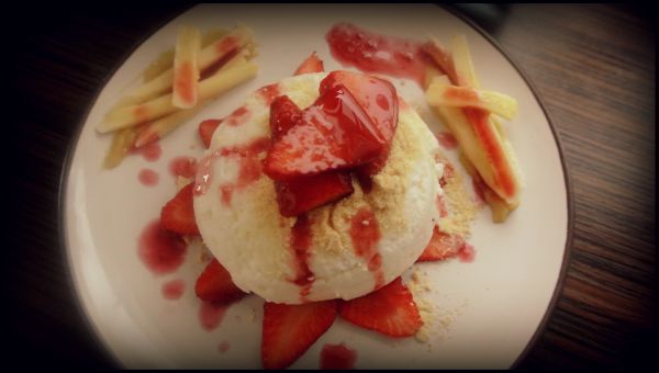 Wyłożyć na talerzyk i udekorować według upodobania. U mnie były to : truskawki, banan, mango, sok malinowy domowej roboty i zmielone herbatniki 🙂