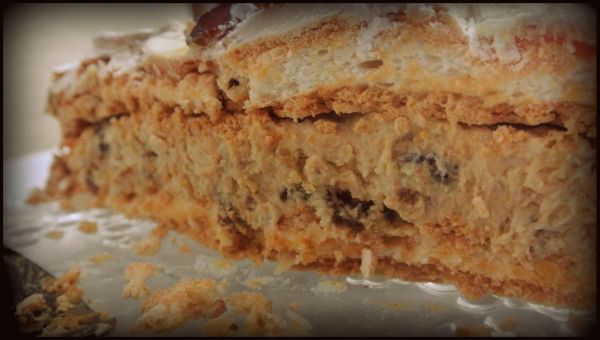 Ten tort również taki jest… chrupiąca i klejąca w środku beza, bardzo smaczne daktyle, kremowe nadzienie i orzechy! No po prostu niebo w gębie. Jedyny minus… takie niebo lepiej serwować rzadko, żeby nie upadło do sfery codzienności: deser jest bardzo słodki, ale inny od tradycyjnych wypieków. Warty wypróbowania!