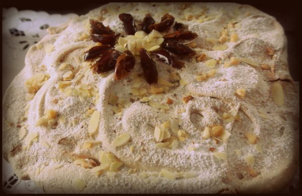 Na pierwszy blat bezy wykładamy cały krem. Przykrywamy drugim płatem i dekorujemy cukrem pudrem, migdałami albo orzechami i oczywiście daktylami. Od teraz nie przechowujemy w lodówce, ponieważ beza może za bardzo się namoczyć. Najlepiej podawać od razu!