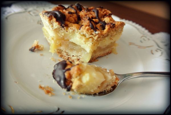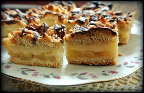 Kruchy placek z mąką orkiszową, budyniem i jabłkami.
