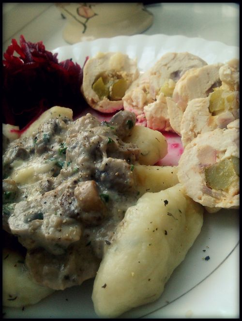 Roladki drobiowe z oscypkiem i kopytka z sosem pieczarkowym.