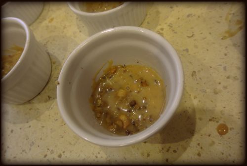 8 małych ramekin wysmarować masłem. Na spód wylać trochę sosu toffi, aby przykrył dno i posypać orzechy. Na to wykładamy masę na pudding – do 2/3 wysokości. Tak samo postępujemy z pozostałymi foremkami.
