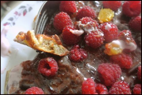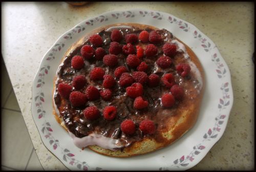 Zrobiłam pyszny biszkoptowy placek owsiany. Podany z powidłami,malinami i dodatkiem jogurtu wiśniowego. Mięciutki, lekki, sycący i zdrowy 🙂