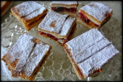 Mąkę wymieszać z proszkiem do pieczenia, solą i cukrem pudrem. Dodać pokrojone na mniejsze kawałki masło i posiekać albo zmiksować. Dodać jajko i żółtka. Na koniec jogurt naturalny. Stolnicę podsypać mąką i wyrobić gładkie ciasto – nie należy za długo zagniatać. Ciasto podzielić na 2 części – ta na spód powinna być trochę większa. Odstawić do lodówki na 2 godziny – można ciasto zarobić wieczorem i wstawić na noc do lodówki.