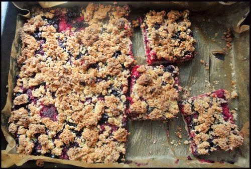 2/3 ciasta wyłożyć blaszkę -wystarczy porozrzucać “okruchy” i przyklepać do dna. Posypać bułką tartą i wyłożyć owoce. Na wierzch dać pozostałe ciasto – zostawiamy w postaci kruszonki. Można dać do wierzchniej warstwy trochę więcej mąki, aby kruszonka była bardziej sucha.