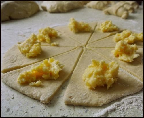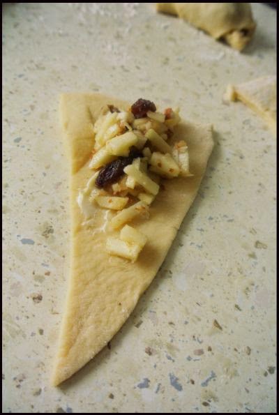 Każdą rozwałkować na kształt okręgu i wykroić 8 trójkątów. Na każdy nakładać farsz i zawinąć.