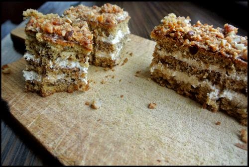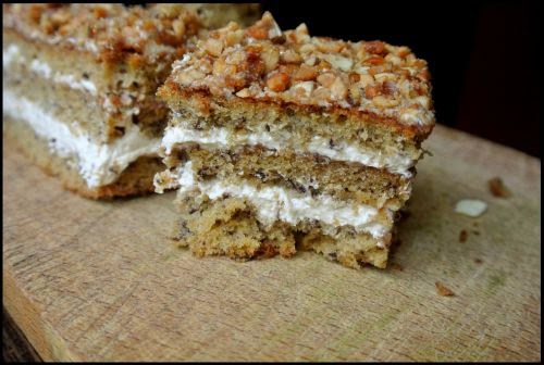 Bananowe blaty przekładane domowym kremem karmelowym, zwieńczone praliną z solonych orzeszków. Brzmi za słodko? Nic bardziej mylnego, ciasto wbrew pozorom nie jest przesłodzone ani mdłe. Ręka sama sięga po kolejne kawałki.