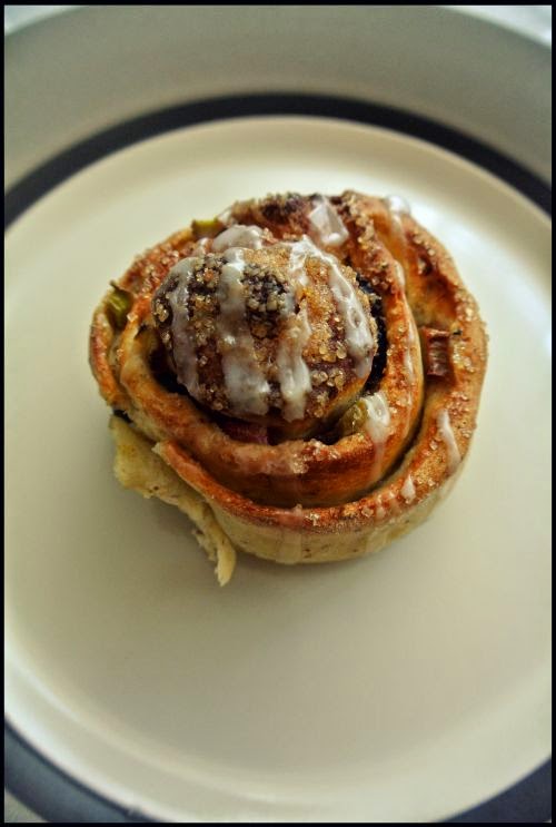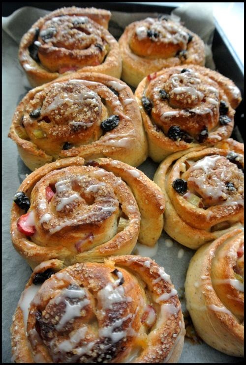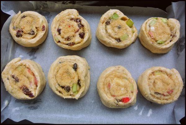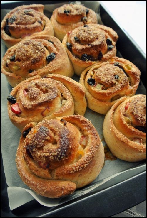 Ciasto rozwałkować na prostokąt o wymiarach 30×20 cm. Posmarować je rozpuszczonym masłem. Cukier wymieszać z cynamonem i rozsypać. Suszone morele posiekać, dodać pozostałe owoce i rozłożyć na całości. Ciasto zawinąć w rulon chwytając za dłuższy bok i ściągając go do siebie. Pokroić na bułeczki.