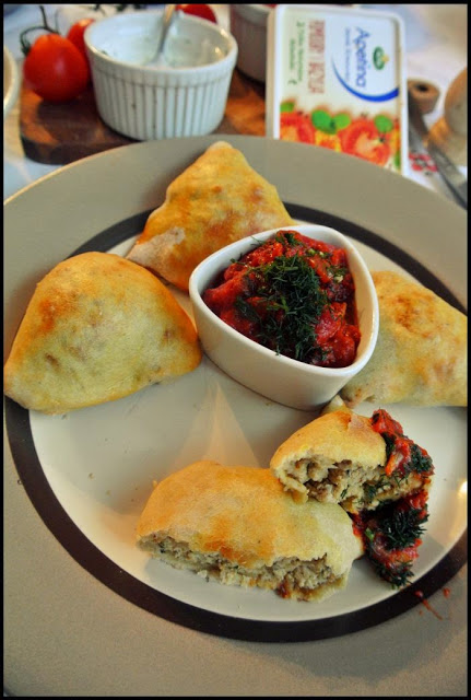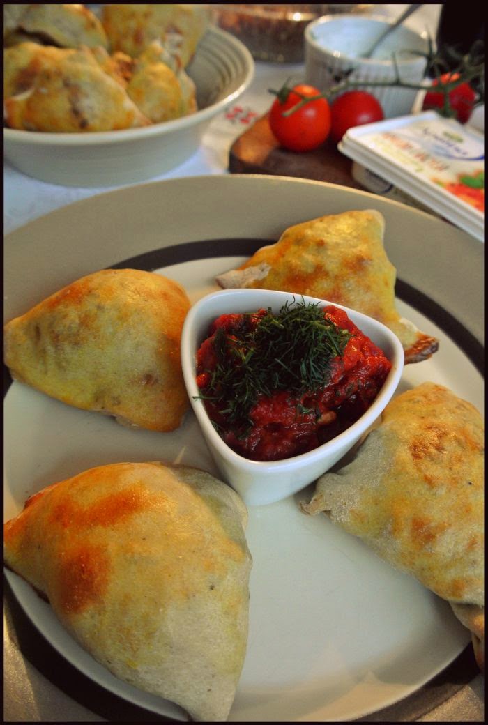 Pieczone pierogi Samosa z farszem mięsnym z bakłażanem i serkiem. Podane z sosem pomidorowym i jogurtowym. Lekko azjatyckie, lekko greckie – przynajmniej dla mojego podniebienia 🙂
