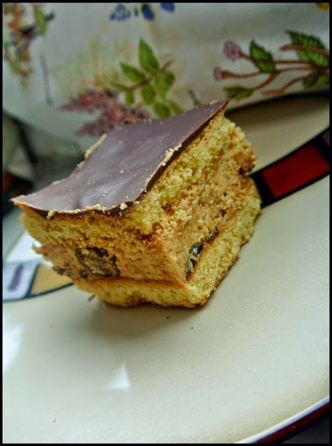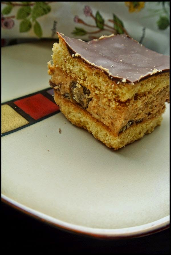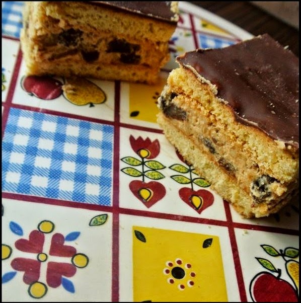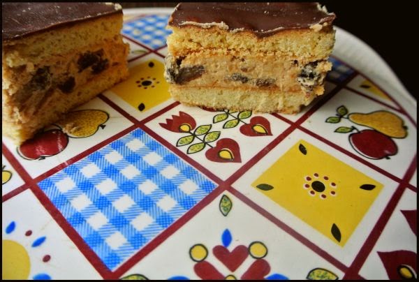 Kruche ciasto z kremem kajmakowym z różnego rodzaju bakaliami i alkoholową nutką. Na to czekoladowa polewa , trochę cierpliwości , żeby blaty skruszały i ciasto jest nasze! 🙂