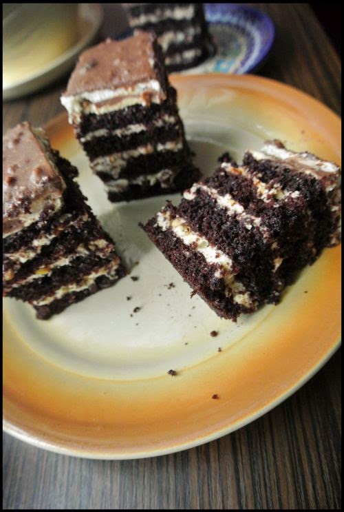 Każdy blat posmarować kremem. Na wierzch zostawić 4 łyżki – ta warstwa może być cienka.
