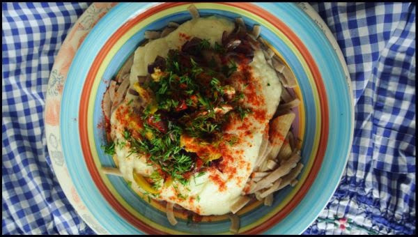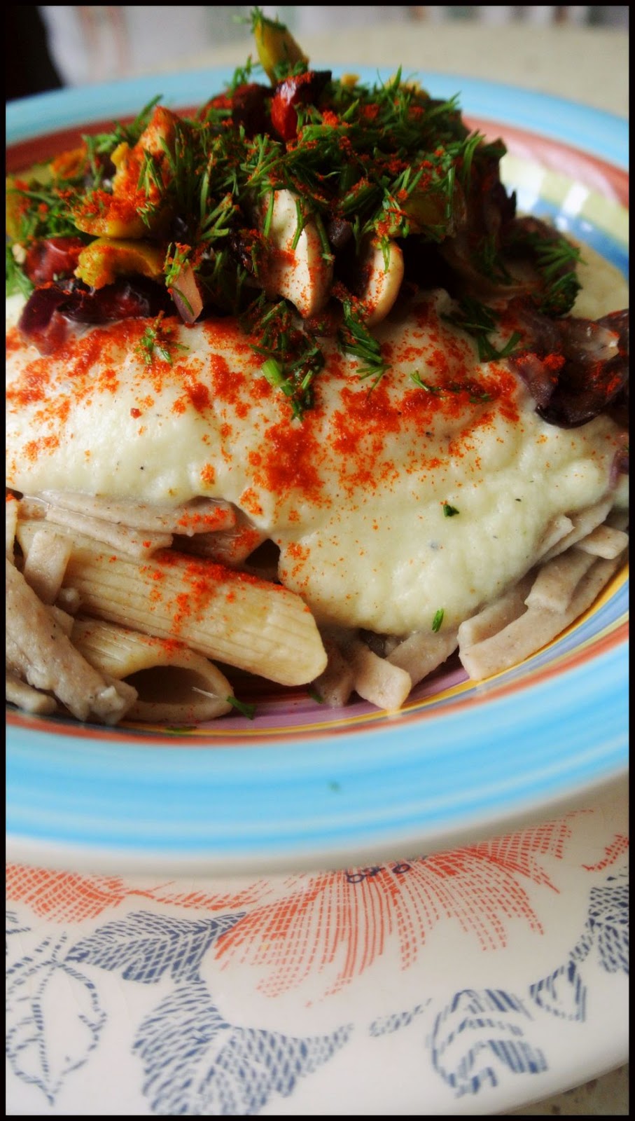 Nałożyć sos kalafiorowy, na wierzch cebulę z pieczarkami, paprykę i oliwki. Całość posypać koperkiem i papryką wędzoną oraz troszkę ostrą.