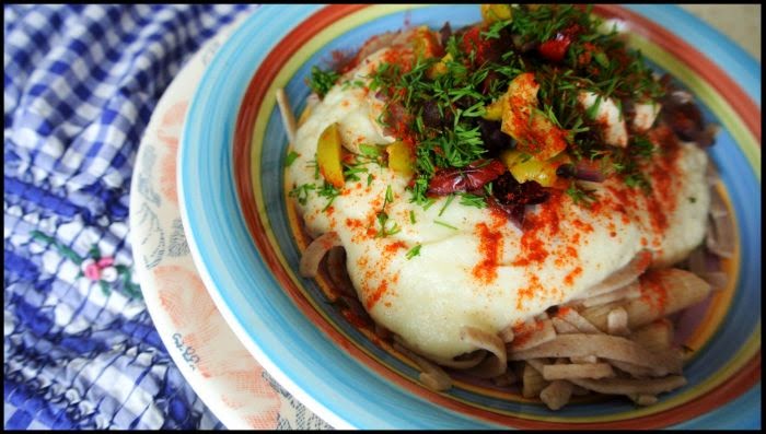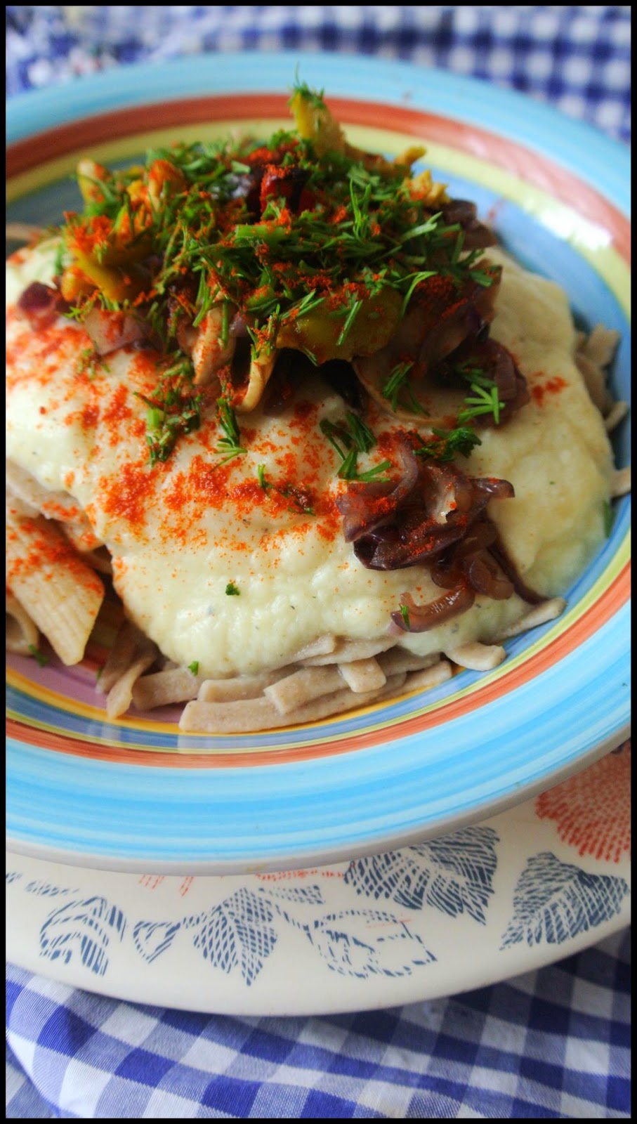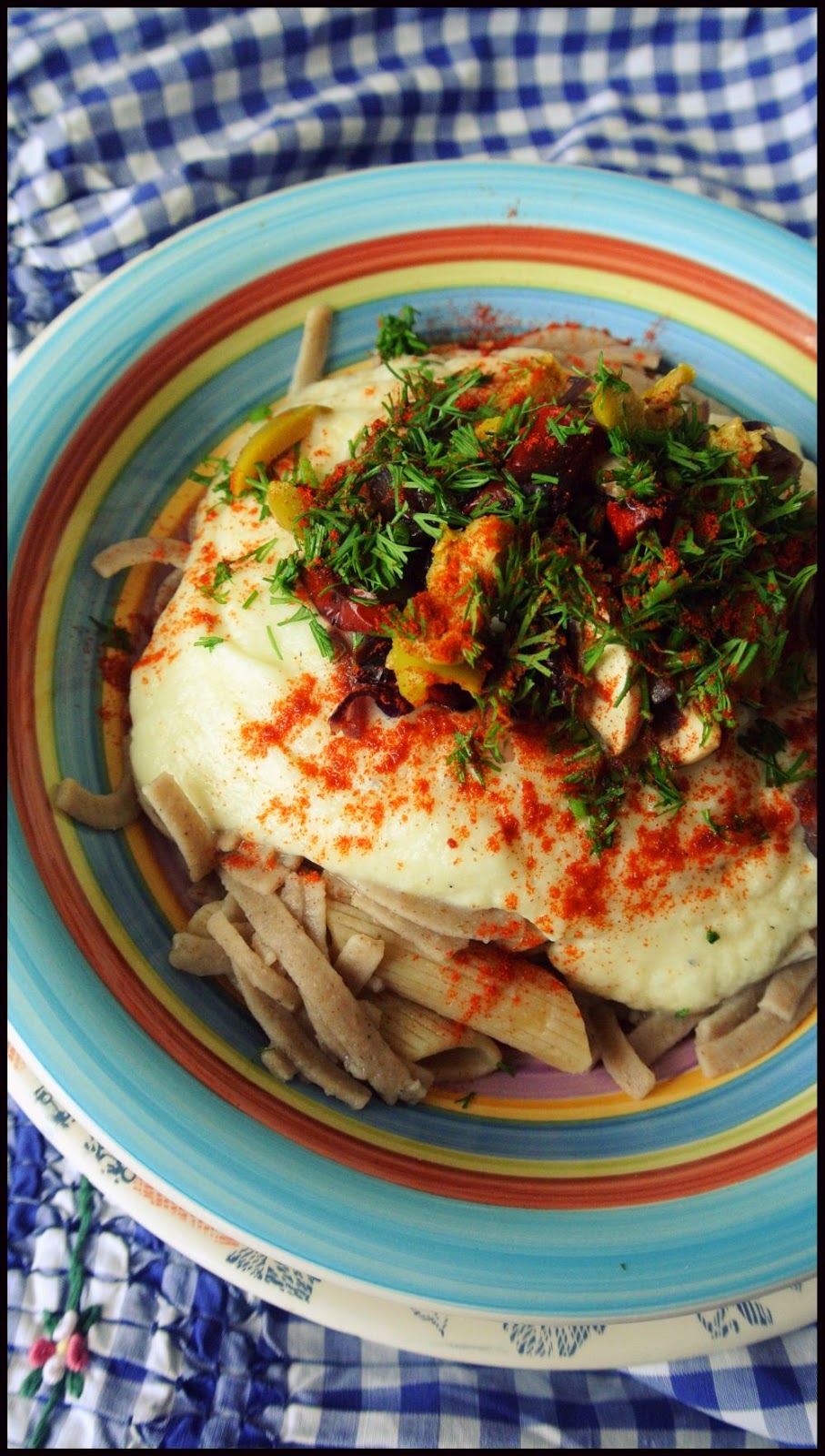 Na talerzu mamy makaron jęczmienny, leki sos na bazie kalafiora, pieczony czosnek i przepyszne dodatki uzupełniające całość.