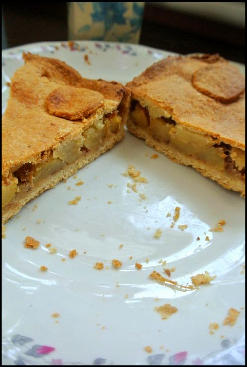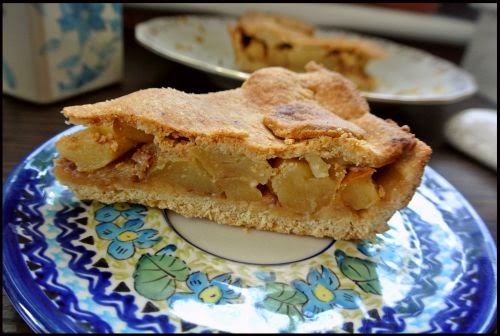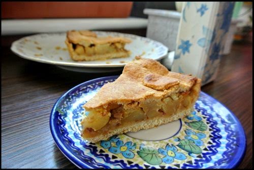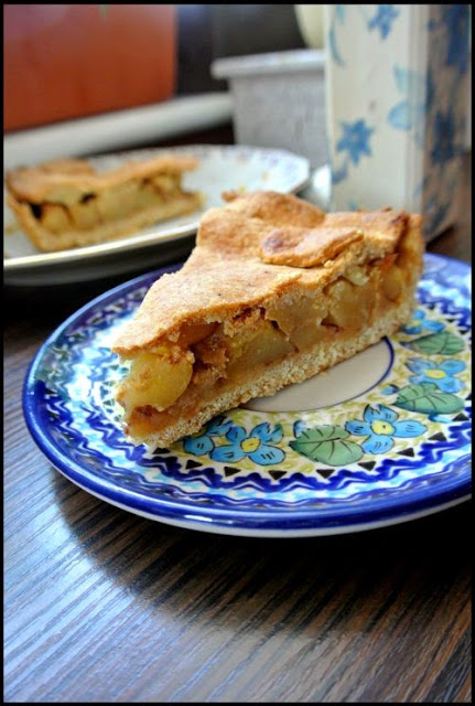 Ciasto jest kruche, nawet bardzo, ale też mniej tłuste. Nadzienie miękkie, ale też czuć strukturę jabłka. Słodycz uzyskana przede wszystkim dzięki daktylom 🙂