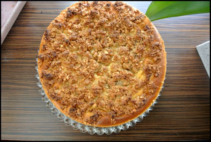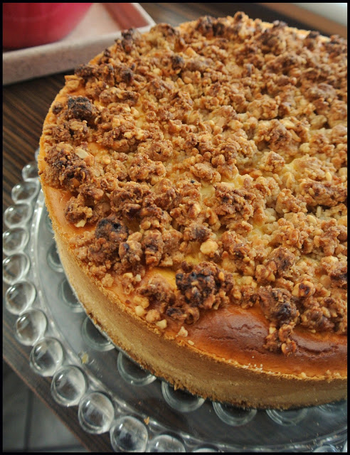 Wylać masę serową. Na wierzch wyłożyć kruszonkę. Sernik należy piec kąpieli wodnej w 170 stopniach przez 60-70 minut lub do momentu, aż masa serowa będzie delikatnie/minimalnie sprężysta w środku, a boki masy sztywne. Kąpiel wodna, czyli na niższej półce w piekarniku należy umieścić naczynie z wodą, która będzie parować.