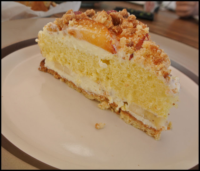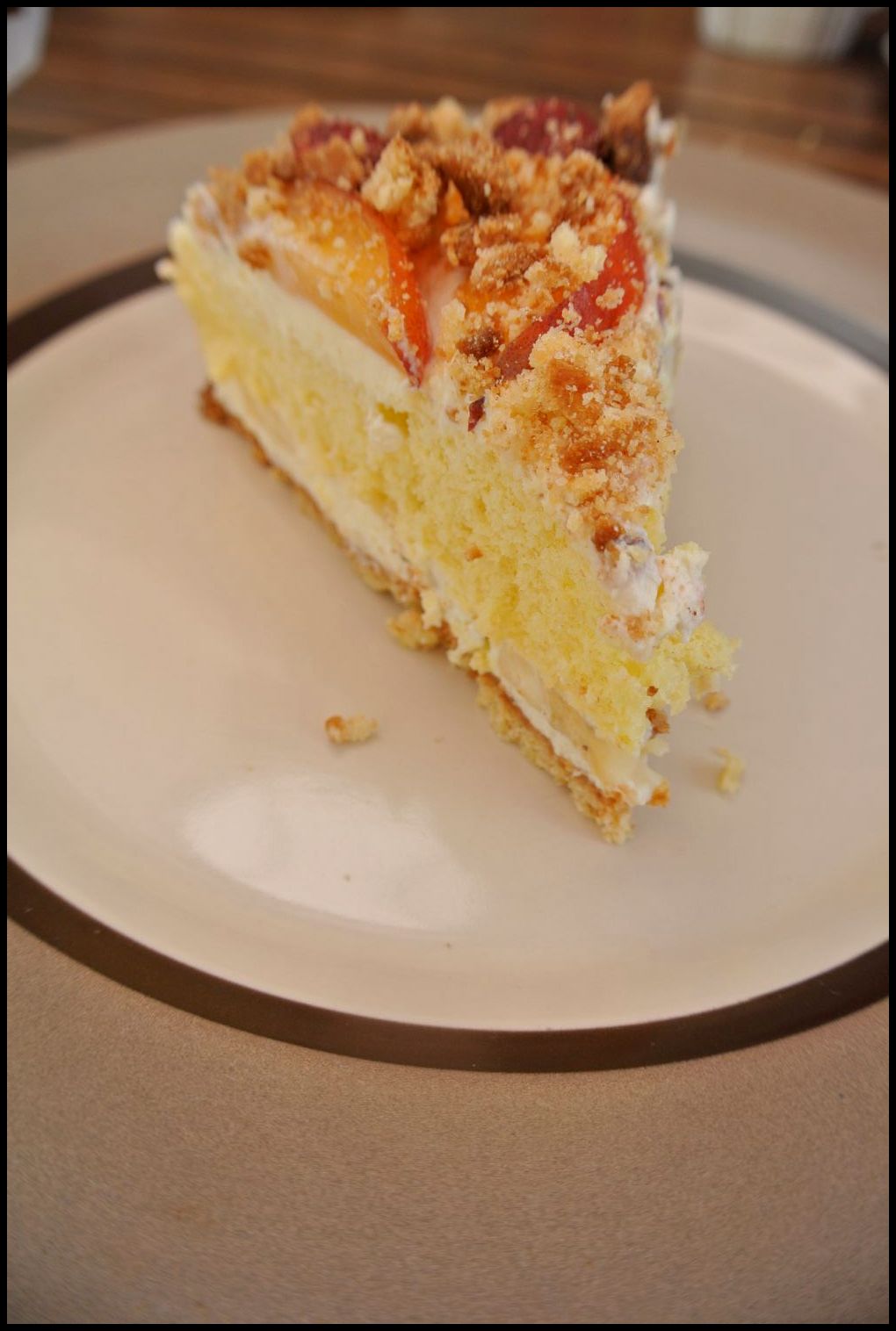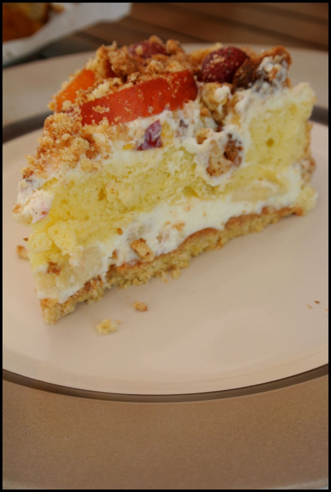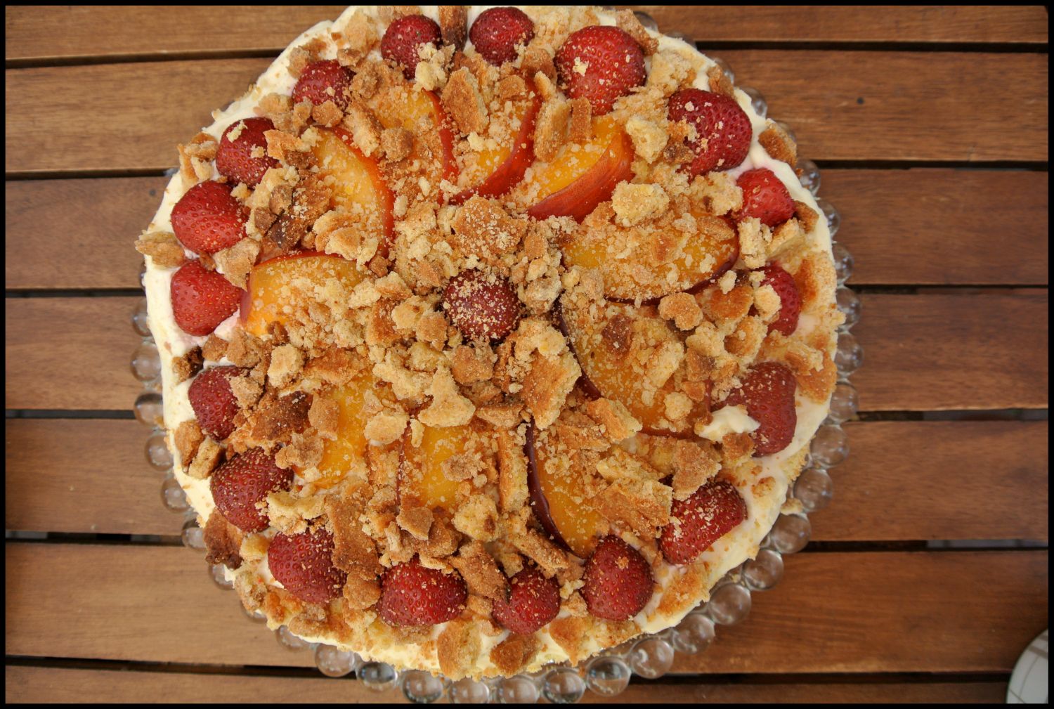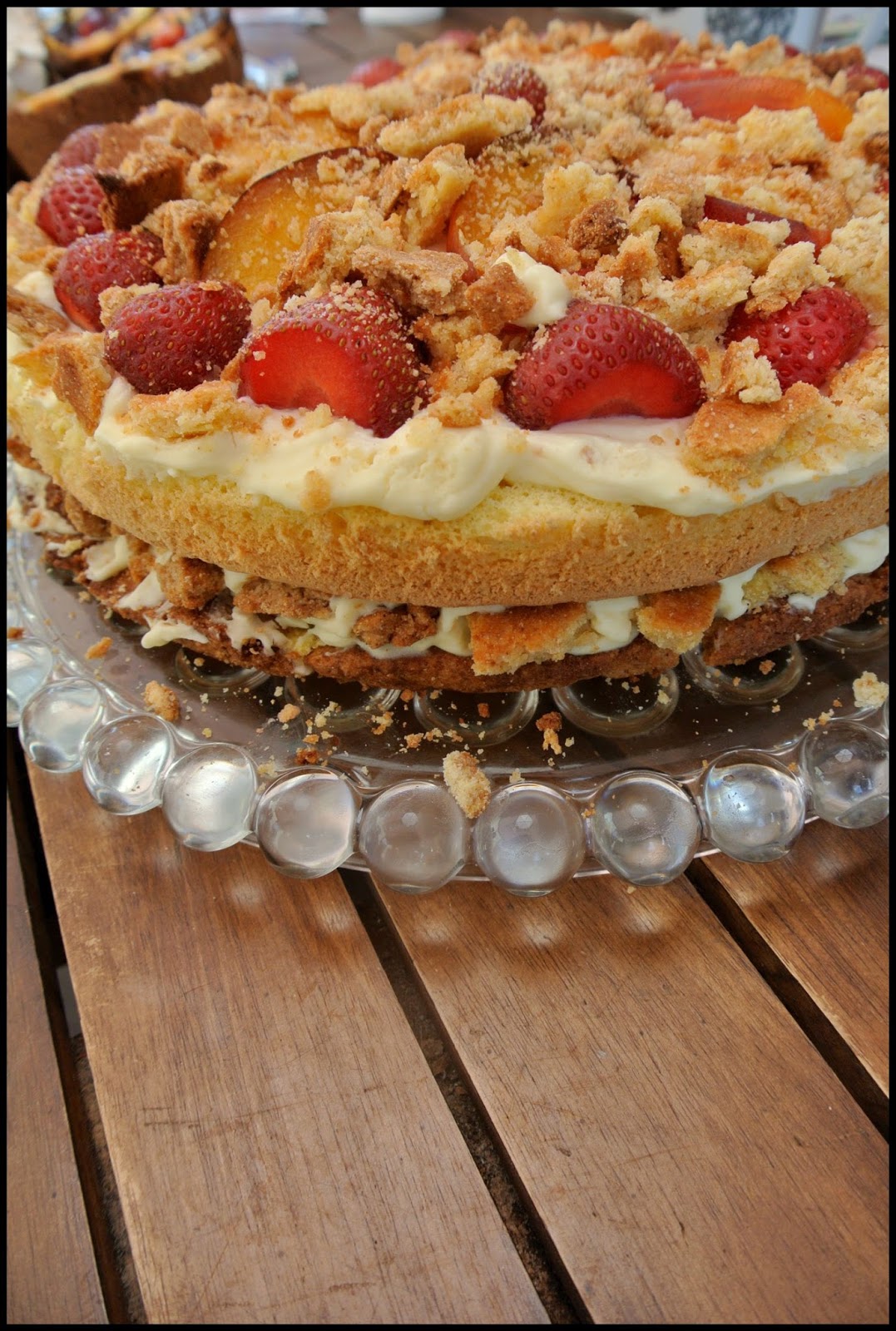 – pokruszony kruchy blat i podprażony biszkopt: okruchy ciasta dałam też na boki przyklejając delikatnie do kremu.