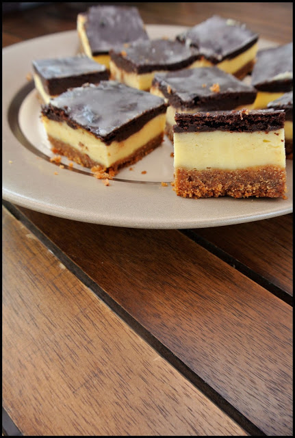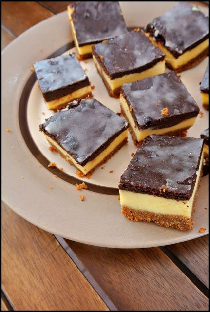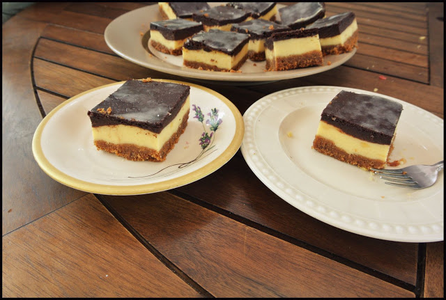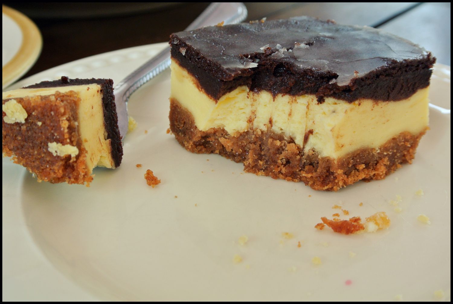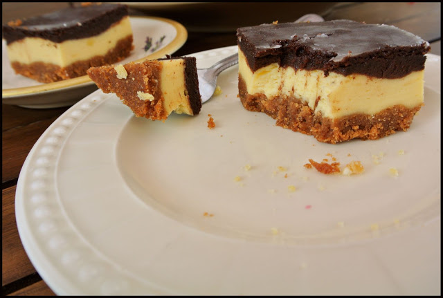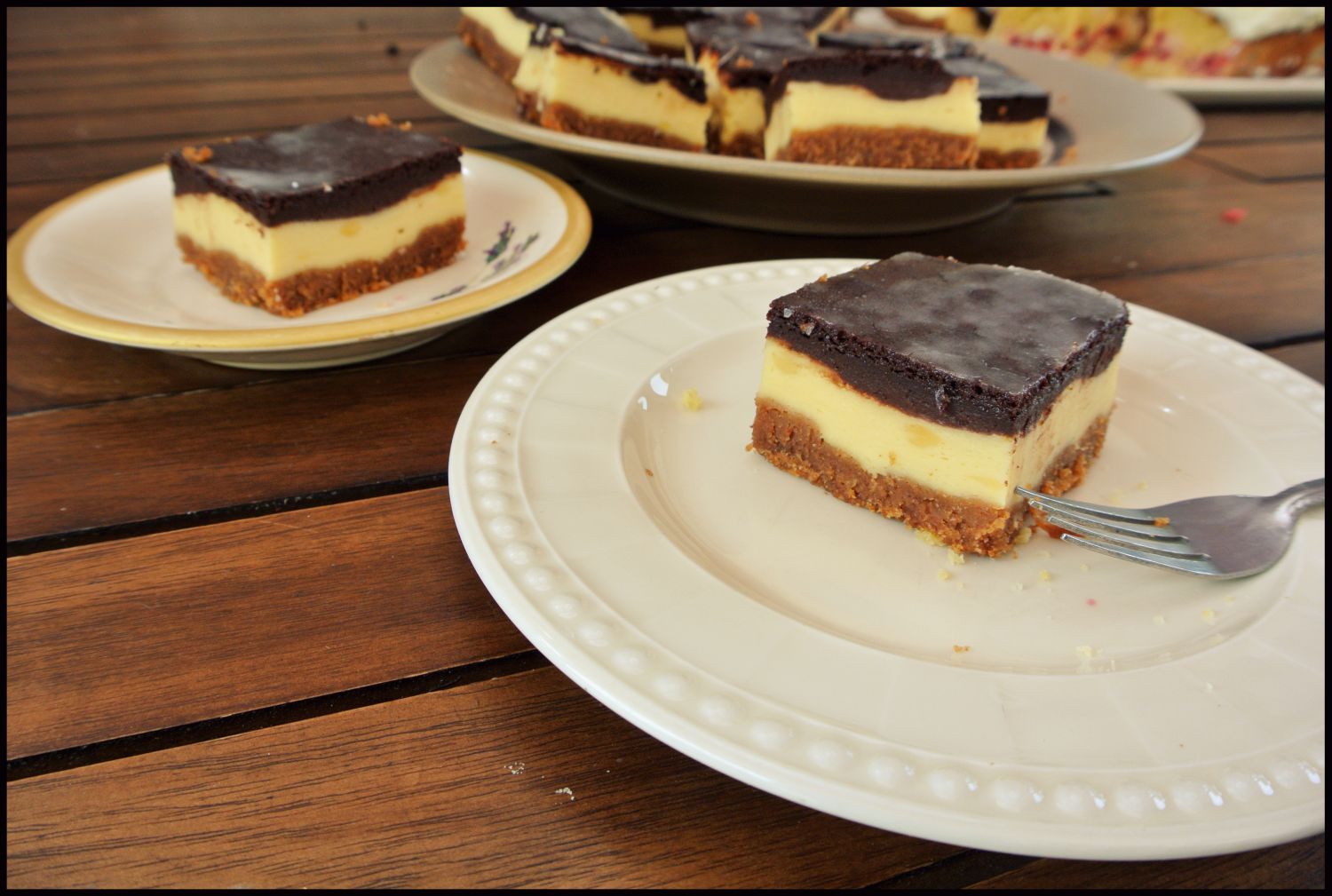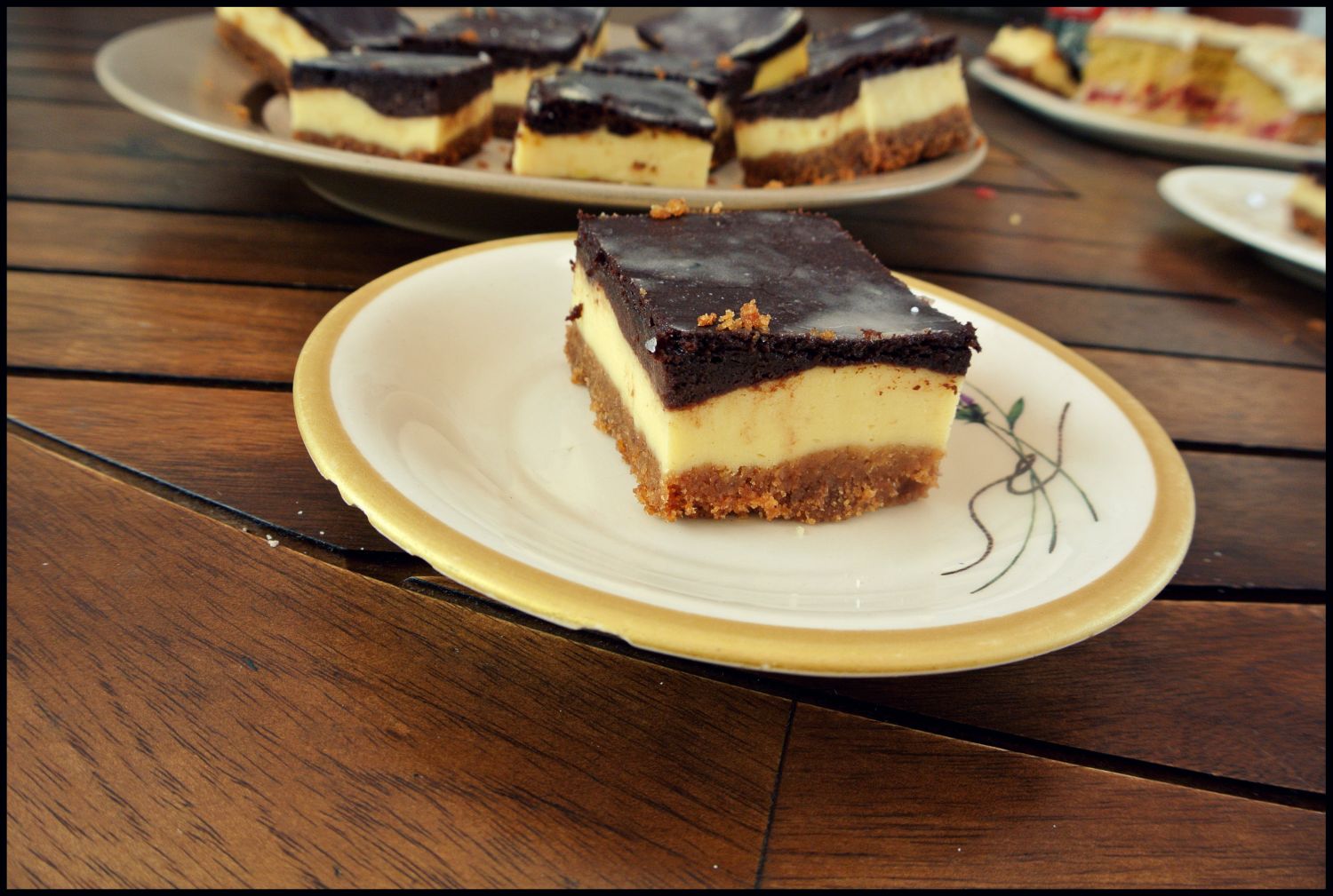 Zrobiłam ciasto, które nie jest wysokim, tradycyjnym, zwartym, polskim sernikiem, lecz wypiek ten przypomina bardziej kostkę czy może krajankę sernikową. Całość osiada na orzechowym chrupiąco-miękkim spodzie, a górną warstwę tworzy czekoladowa masa serowa. Na całości dodatek lukru.