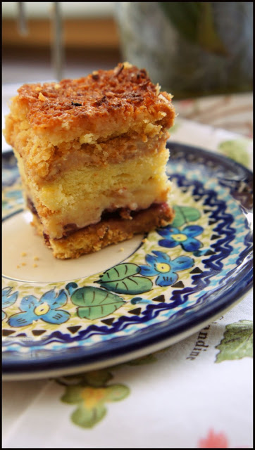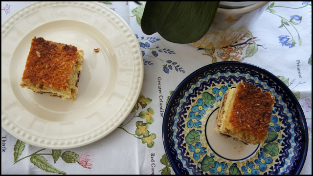 Bardzo lubię kokosa i wszystko co się z nim wiąże. Ciasto kusi niemiłosiernie… I jakie piękne talerzyki…