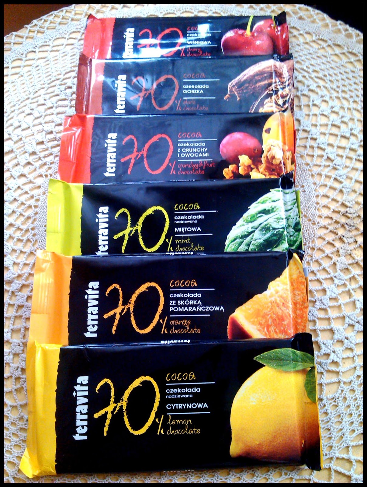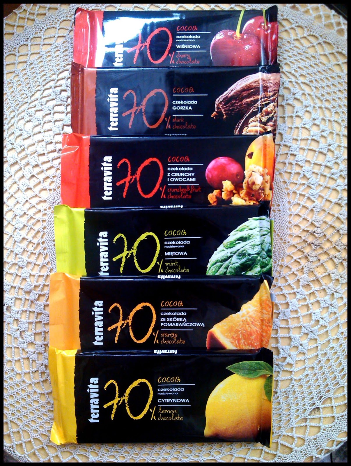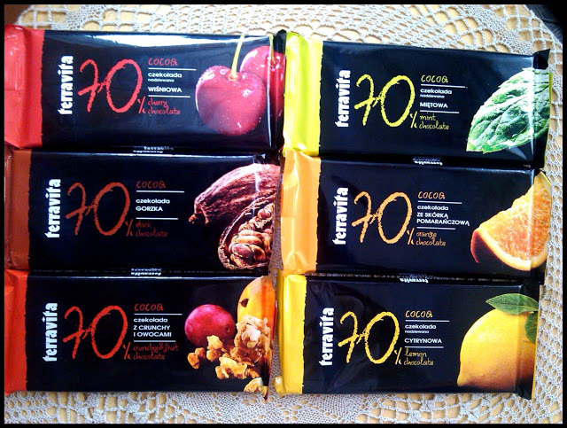 Dzisiejszy wpis nie dotyczy przepisu, ale jest moją małą subiektywną opinią o czekoladach Terravita. Firma wypuściła nową edycję czekolad gorzkich 70% kakao o różnych smakach. W sumie jest 6 bardzo ciekawych wersji. Do tej pory udało mi się z pomocą domowników przetestować już kilka smaków. Oto nasze opinie: