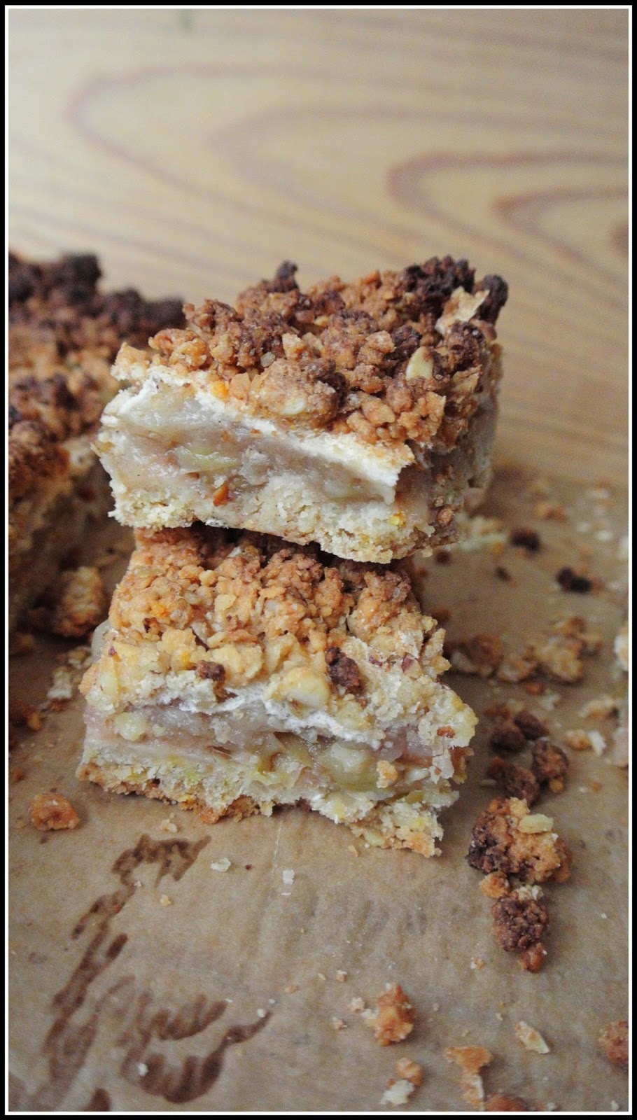 Formę wyłożyć papierem do pieczenia. Na spód dajemy większą część kruchego ciasta. Posypujemy delikatnie mąką owsianą/jaglaną/ryżową/ziemniaczaną. Wyłożyć jabłka, na to piana z białek. Na wierzch wysypać kruszonkę- może być odrobinę klejąca.