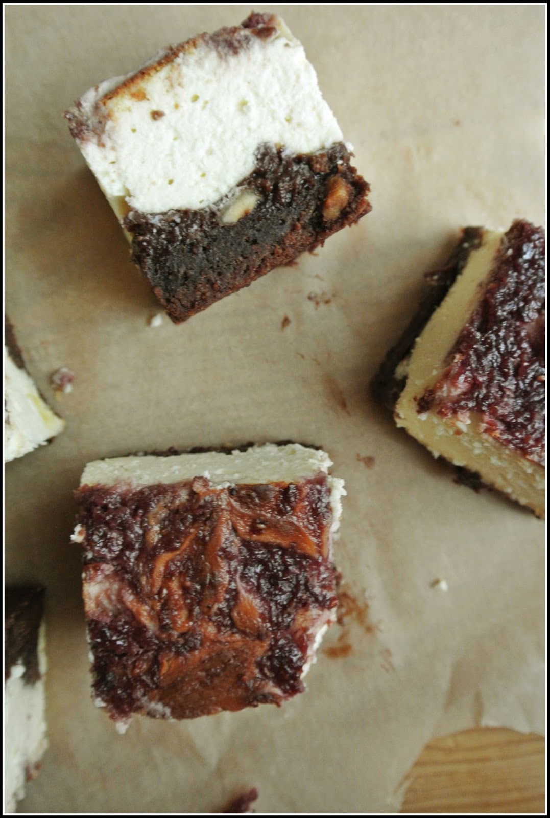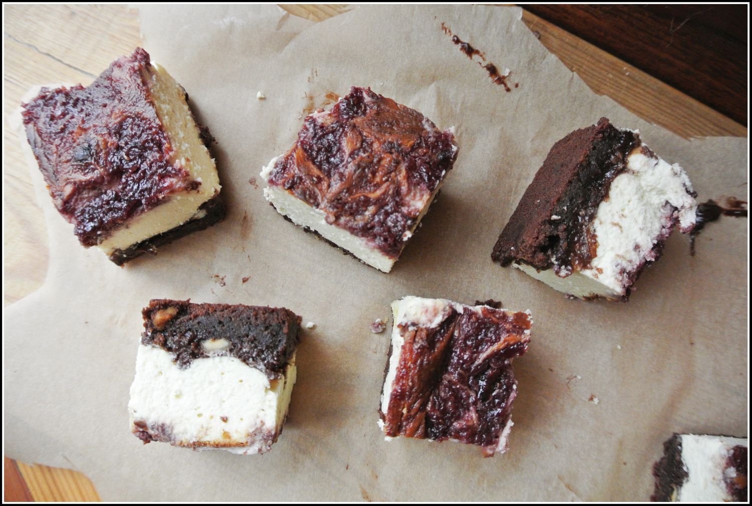 Formę o wymiarach 20×30 wyłożyć papierem do pieczenia. Wylać ciasto czekoladowe. Na ciasto łyżka po łyżce wykładać masę serową. Na wierzch również za pomocą łyżki nałożyć mus. Następnie zrobić wzorki używając patyczka.