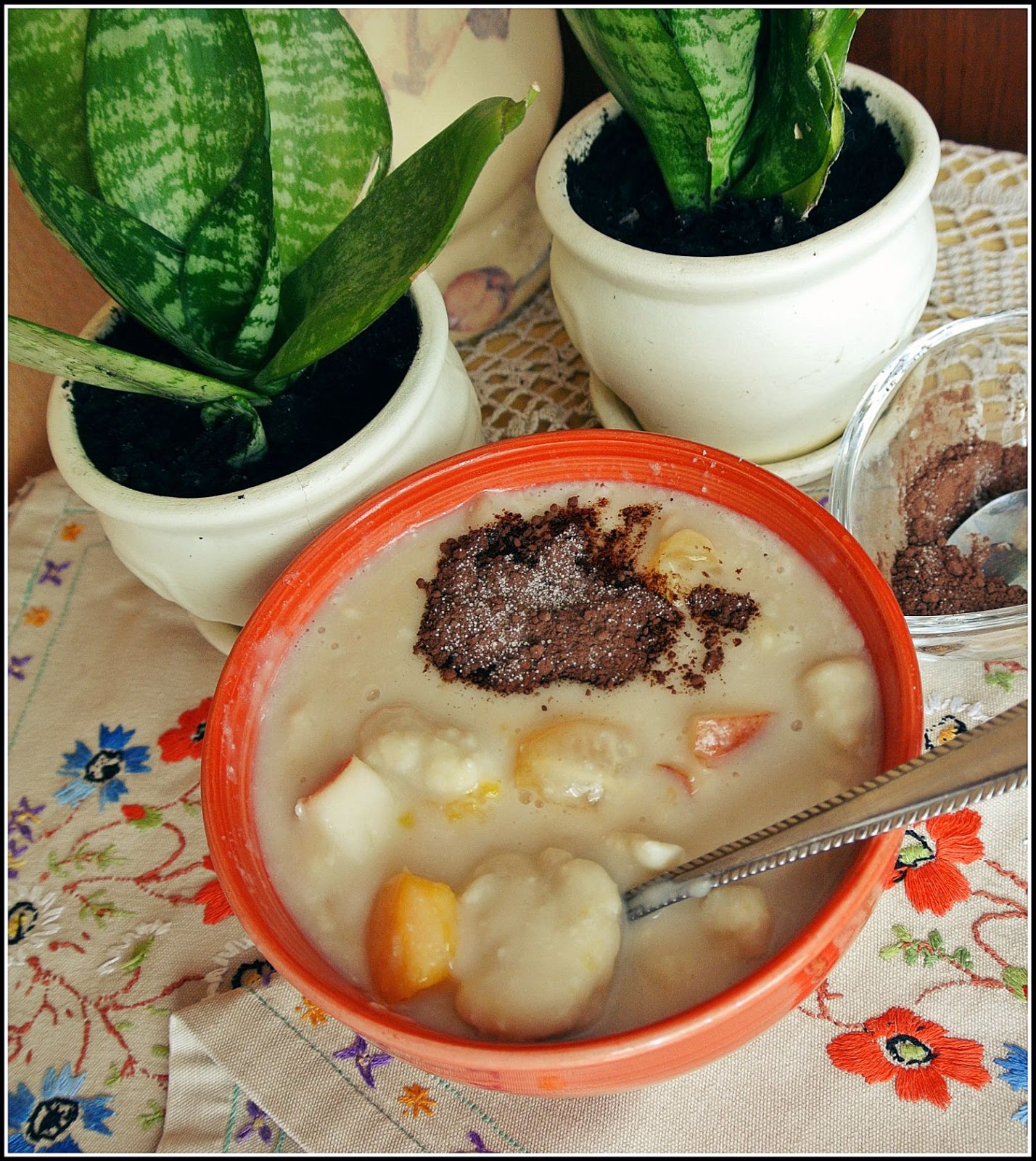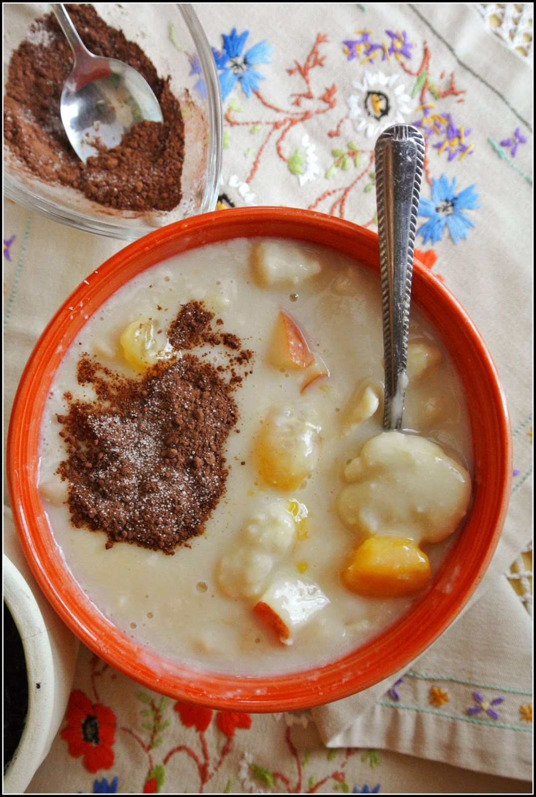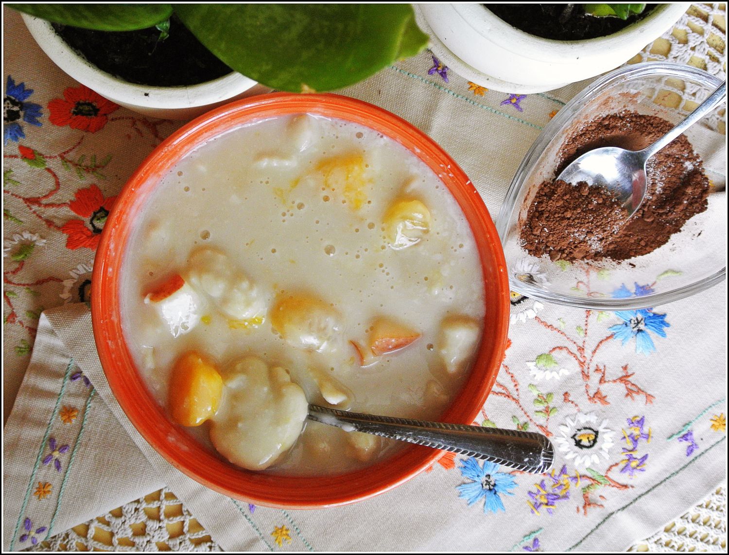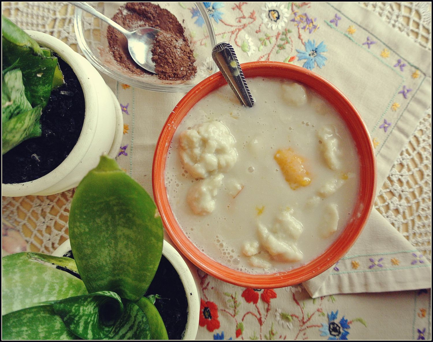 Mleko zagotować. Nakładać porcje masy do mleka i gotować na małym ogniu przez kilka minut. Kluski wypłyną na wierzch. Dodać owoce, a na wierzch kakao.