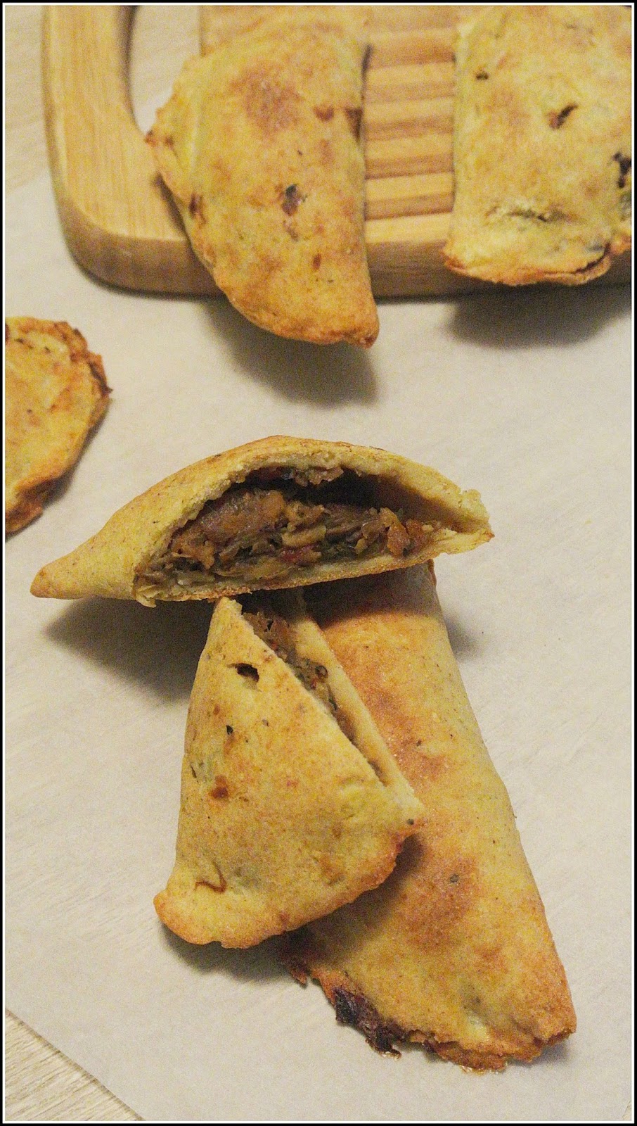 5 min.przed zakończeniem pieczenia pierożki można delikatnie posmarować olejem, wtedy skórka będzie bardziej chrupiąca 😉