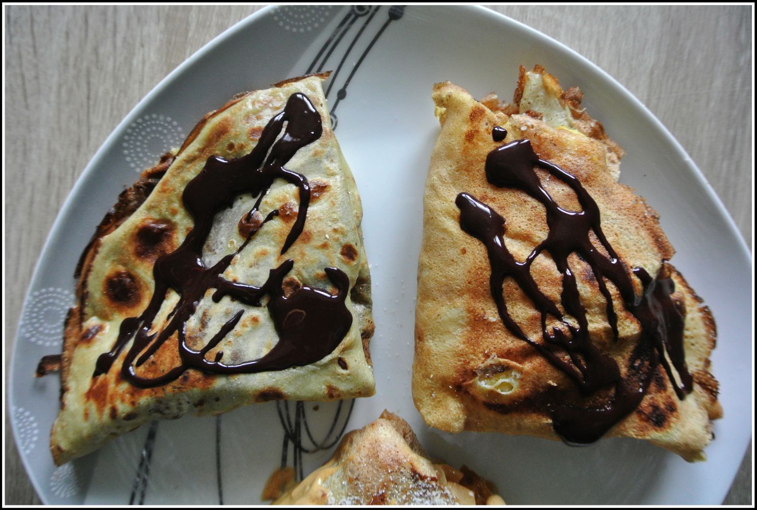 Naleśnik z jabłkiem jest polany masłem orzechowym, a dwa pozostałe to polewa z kakao, erytrolu, odrobiny syropu klonowego i mleka roślinnego.