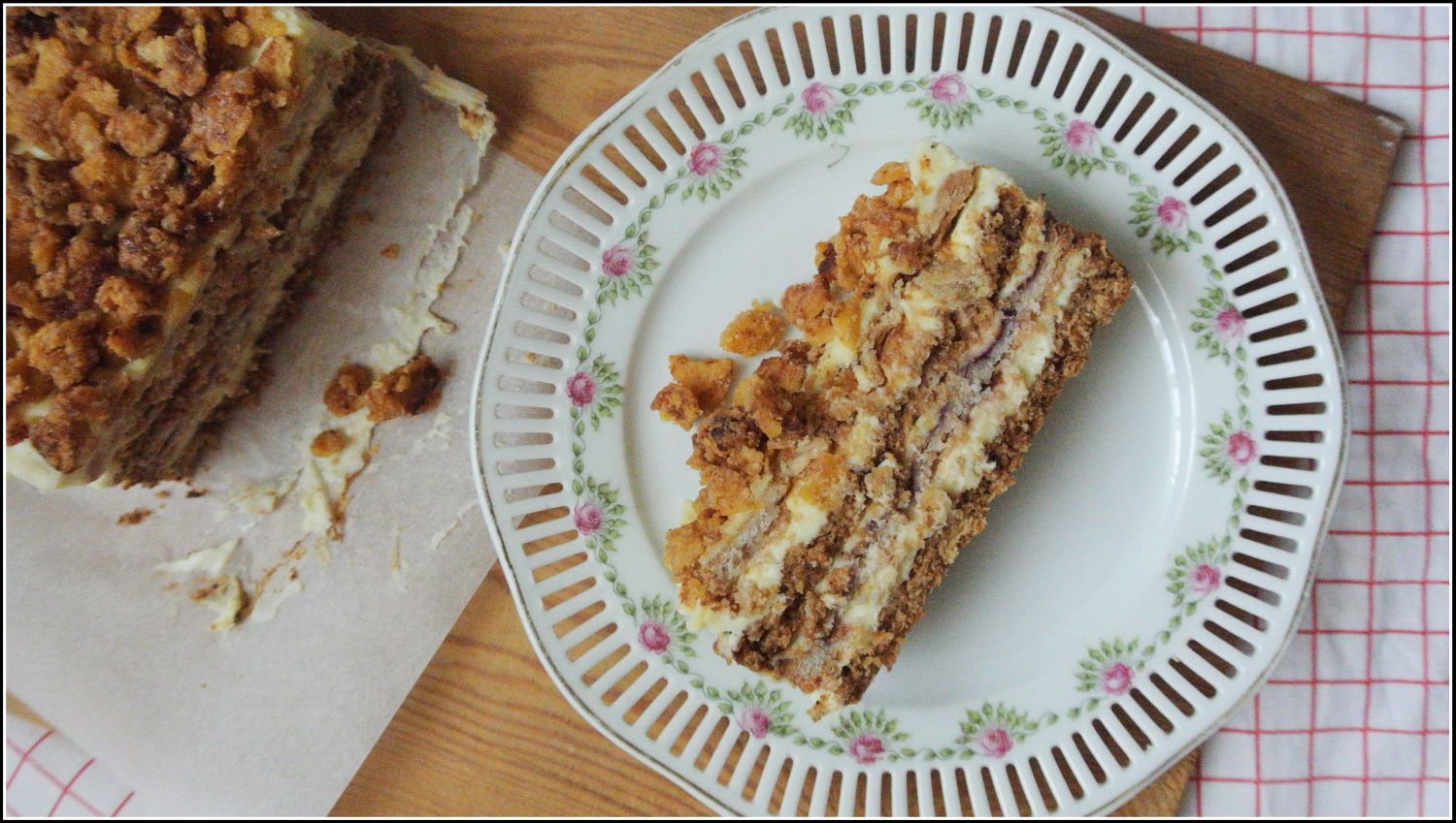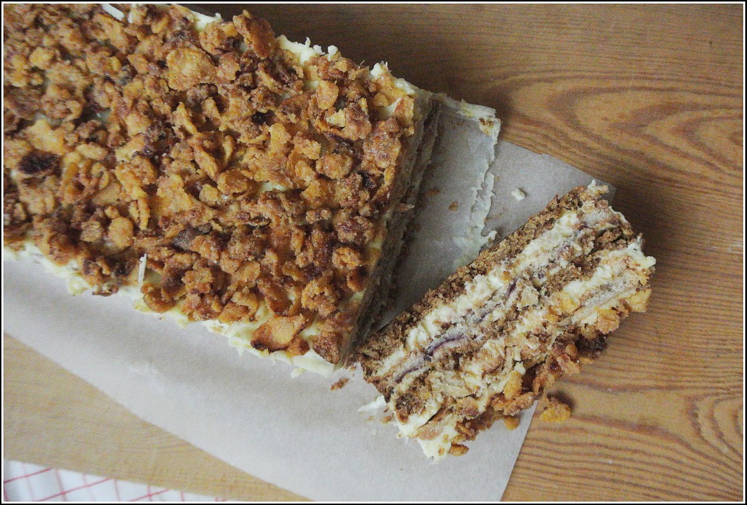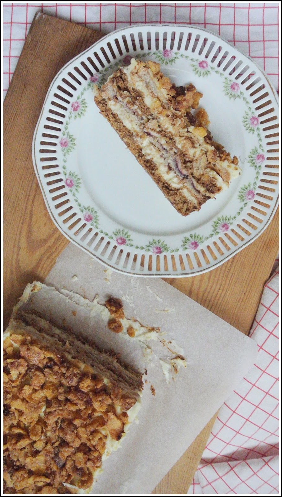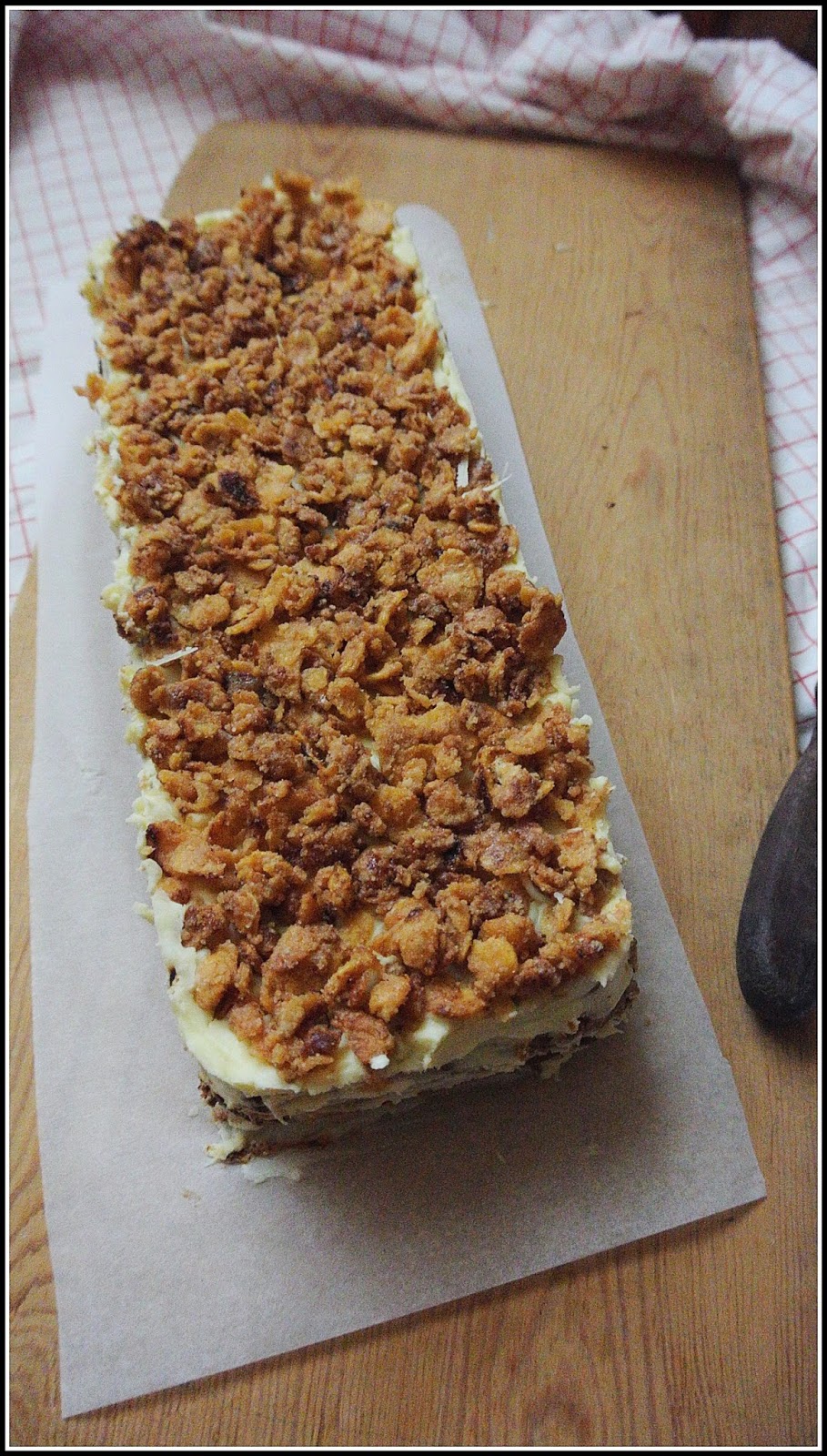 Coś dla wielbicieli przekładanych ciast, które cieszą również oko. Bardzo smaczne połączenie, masy serowej, kruchych blatów, orzechów, owocowej nuty oraz nietypowego dodatku w postaci lekko solonych karmelizowanych płatków kukurydzianych. Taki oto sernik gotowany w wydaniu przekładanej kostki z przełamującą nutą dżemu.