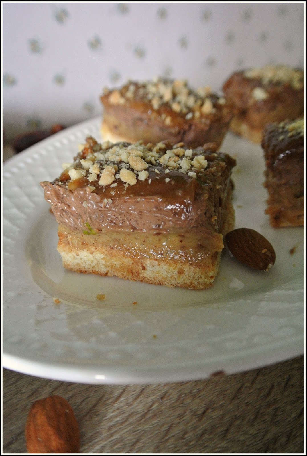 Masę czekoladę wyłożyć na schłodzoną wasrtwę migdłowo-karmelową.