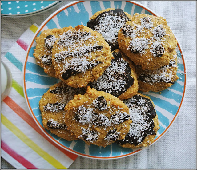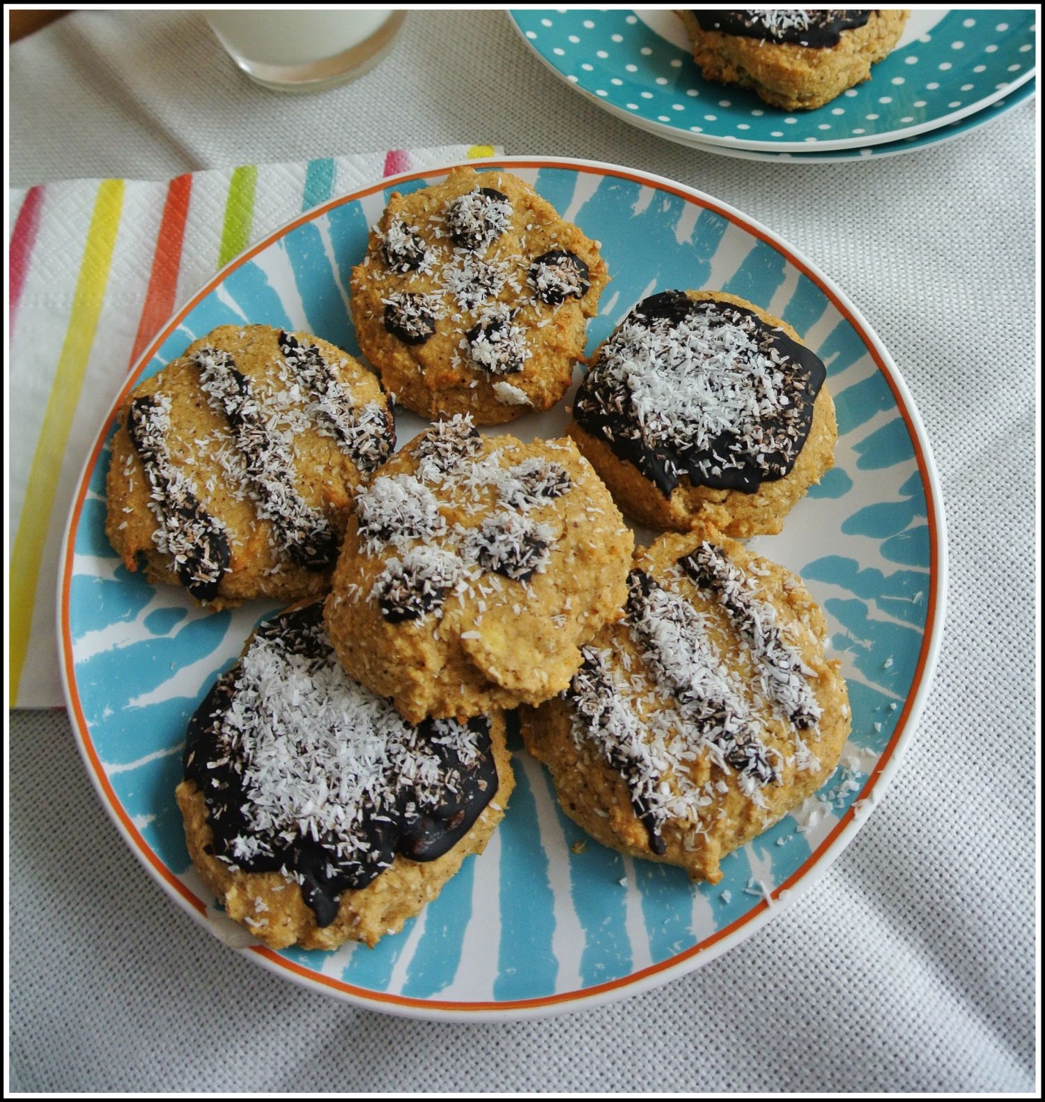 Ciastka udekorowałam rozpuszczoną czekoladą gorzką z niewielką ilością mleczka kokosowego i nierafinowego oleju kokosoweg. Wierzch posypałam wiórkami kokosowymi.